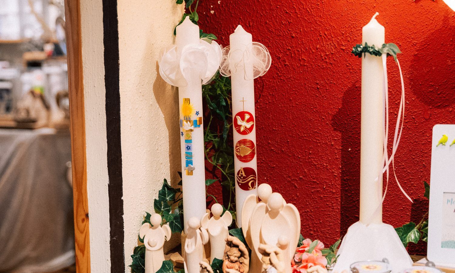 Wir haben für jeden Anlass und jedes kirchliche Fest handgearbeitete Wachskerzen mit verschiedenen Motiven in unterschiedlichen Formen und Farben im Angebot. Wir gestalten Ihre Kerze nach Wunsch, mit Ihrem Wunschmotiv und mit individueller Beschriftung. Auch Kerzenverzierungen fertigen wir nach persönlichen Wünschen.